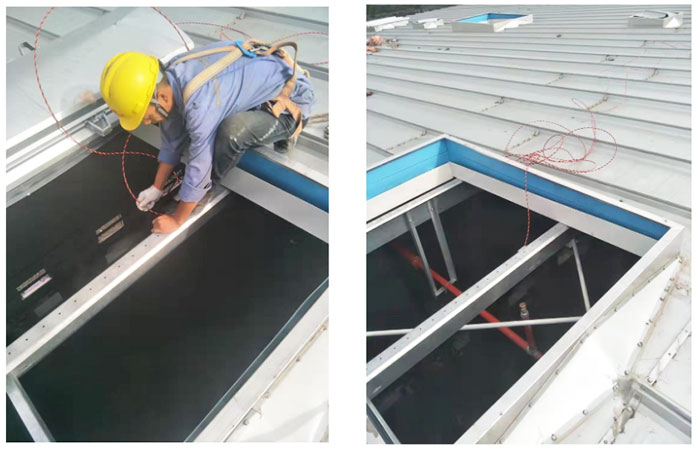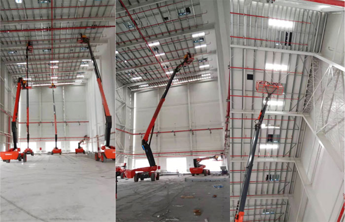 徐州鑫友排煙天窗安裝團(tuán)隊(duì)入駐浙江5210物資公司寧波工廠,正式進(jìn)入PM包裝廠房,備品備件立體庫(kù)的圓拱形天窗施工安裝中。上圖為安裝人員利用升降車作業(yè)中。