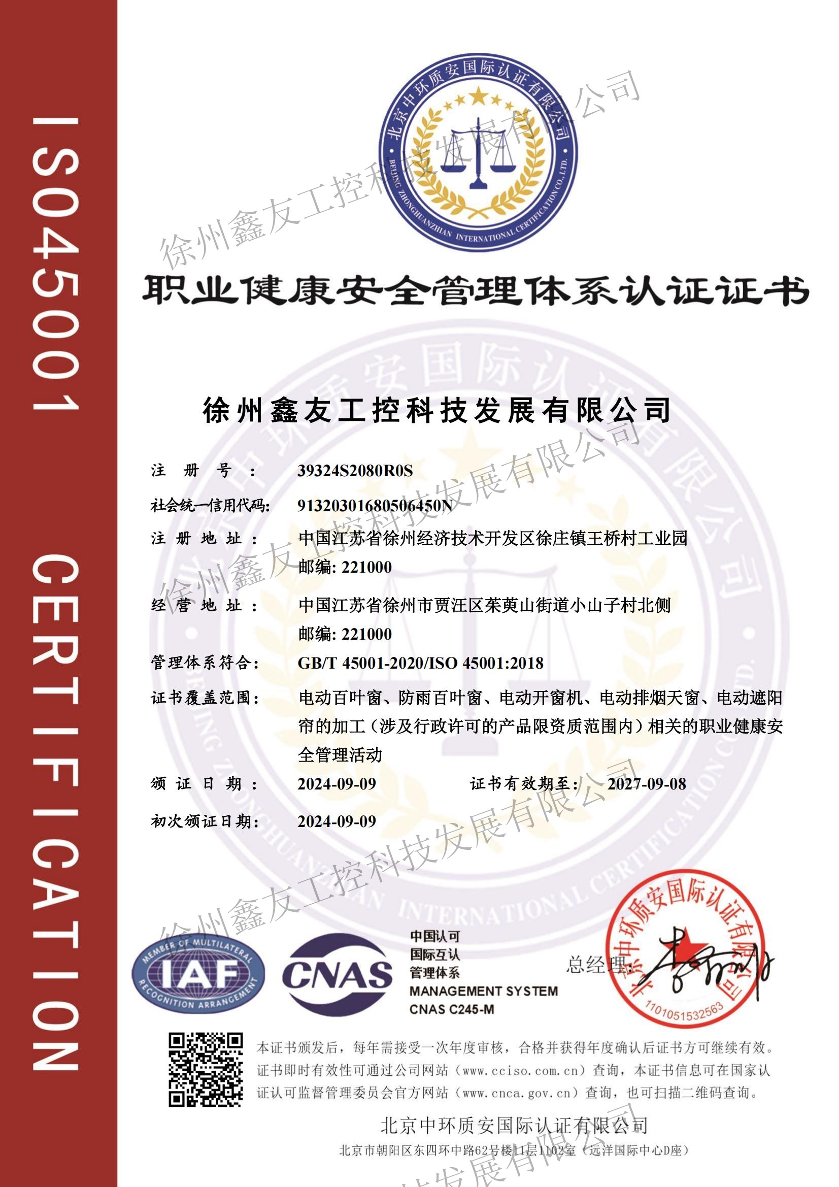 職業健康安全管理體系認證證書